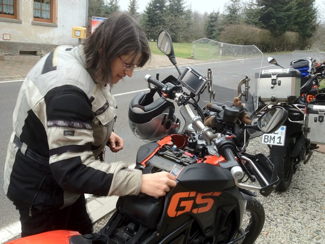 Wieder auf „Betriebstemperatur“ ging es nach der Moselquerung in eleganten Schwüngen durch die Weinberge dem Hunsrück entgegen. Dieser gab sich etwas freundlicher, der Nebel löste sich auf und die Temperaturen kletterten auf sagenhafte 6 °C, die Sonne „wärmte“ die Nase durch das Visier. Die schmalen, kurvigen Sträßchen taten ihr übriges und die Laune stieg mit jedem gefahrenen Kilometerweiter nach oben. Allerdings „wärmte“ die Sonne nicht genug, denn immerhin bekam meine Emma Batterieprobleme, die Heizjacke und Heizgriffe fielen zeitweise aus. Ich vermutete Elektrikprobleme, die möglicherweise mit einem Neustart des Bordcomputers zu beheben wären (bei der alten Eintopf-F ein simpler, aber zumeist erfolgreicher Reparaturtipp!). Dies erwies sich aber als fataler Fehler, denn – einmal ausgeschaltet – ist die leergelutschte Batterie zu schwach zum Anlassen. Für die beheizten Handgriffe plus Navi plus Zusatzscheinwerfer plus Heizjacke ist die Lichtmaschine wohl nicht ausgelegt. Mittels artistischer Verrenkungen konnte das Handy in der Einsamkeit des Entenpfuhls (so heißt der Ort wirklich, dort sind wir nicht gelandet!) doch zur Verbindungsaufnahme mit den gelben Engeln bewegt werden. In der Zwischenzeit entfernten wir mittels des sehr übersichtlichen Bordwerkzeugs (ausnahmsweise hat man(n) KEIN Werkzeug mit) die Tankattrappe und legten die Batterie frei.