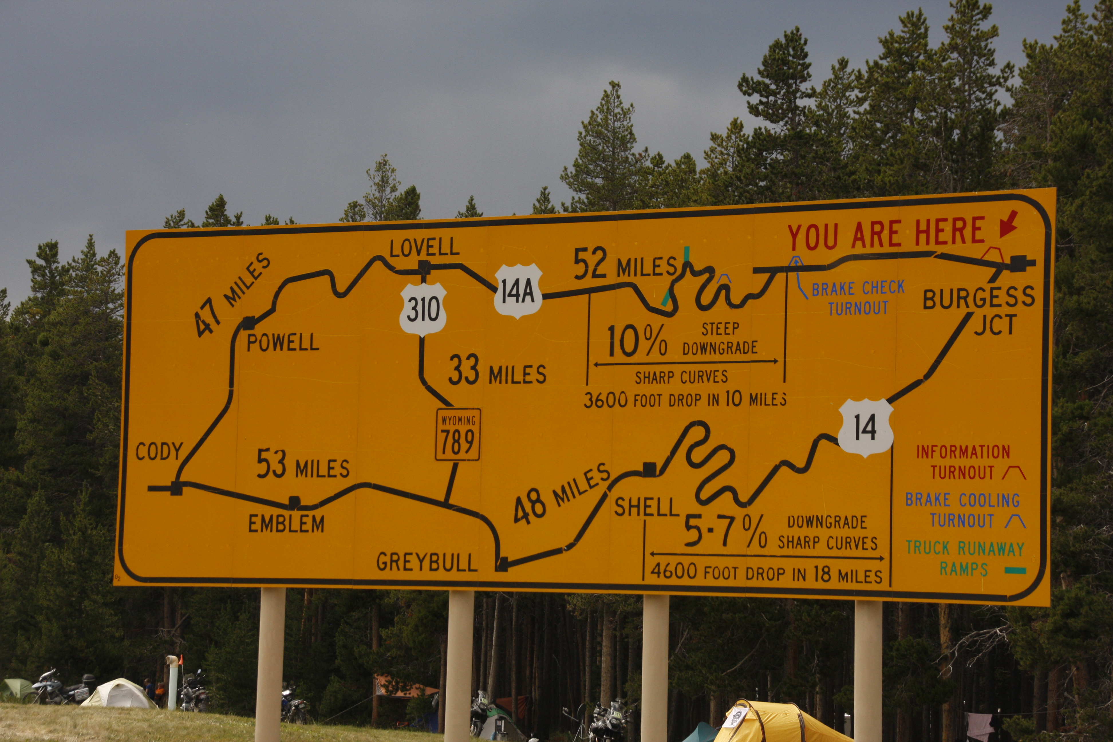 Im 70 km entfernten Sheridan sind es 34 °C, wir fahren den Pass hier hoch auf 2500 m, es kühlt auf unglaubliche 14 °C ab. Wir frieren! Aber es ist nicht weit und es geht auch wieder etwas runter, aber die Temperatur bleibt bei 16 °C stehen. Na, einen Vorteil hat es ja: Es gibt auf dieser Höhe keine Stechviecher!!!