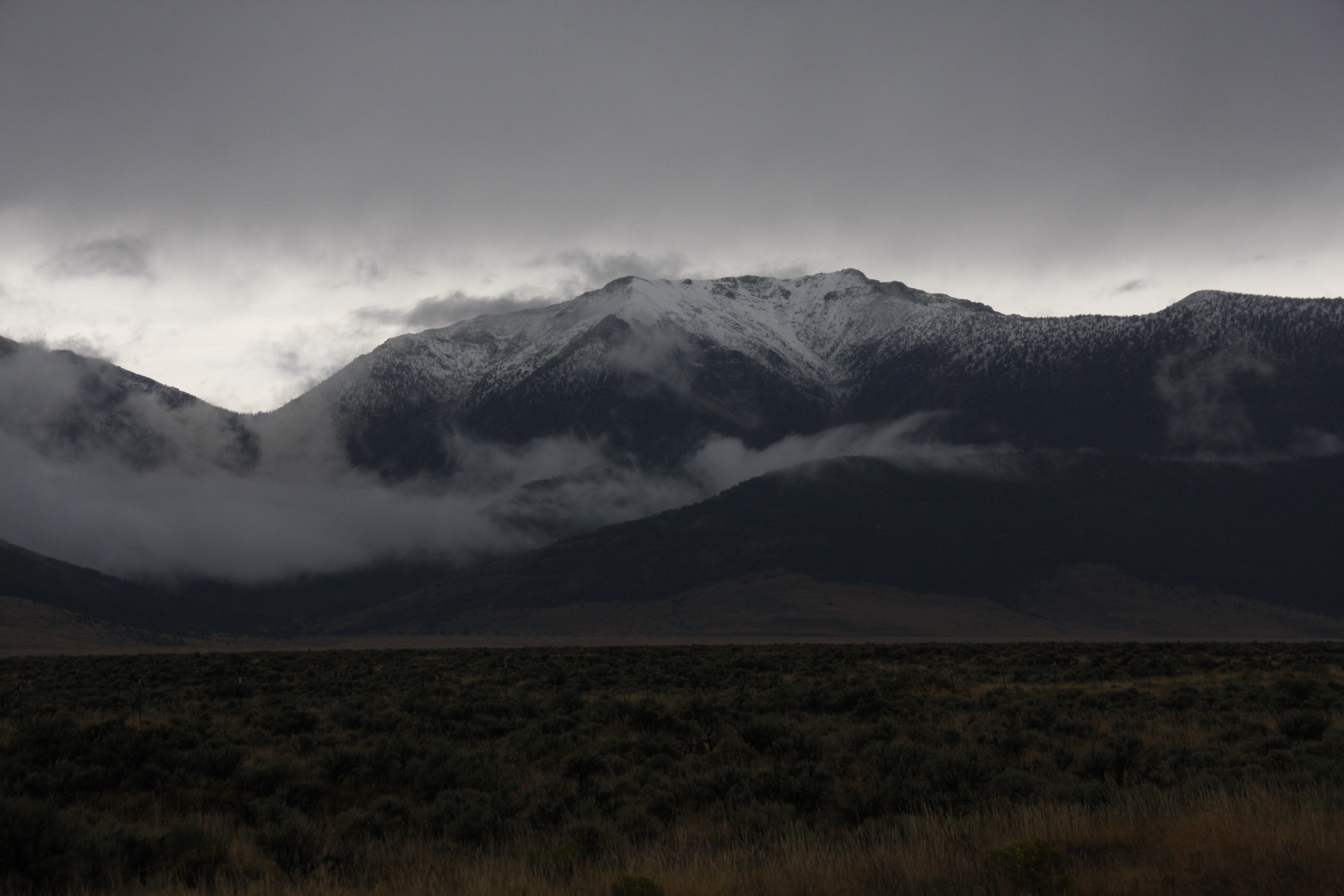 Langweiliger Fahrtag nach Missolula mit vielen Geradeaus-km zum BMW Händler – hab ich gedacht. Pustekuchen. Wir starten bei 17 °C morgens um 9, aber nach 30 km kündigen dicke ausfransende Wolken Regen an. Hier in der Halbwüste, wo jeder trotzdem den Rasen sprengt? Na, gut, Regensachen an und sicherheitshalbe noch ein langes Pullöverchen drunter. Es kommen tatsächlich nur ein paar Tropfen, aber es wird kalt und kälter. Ich verstecke mich hinter dem Windschild, aber es wird einfach nicht wärmer. Bis auf 5 Grad geht es runter. Ich friere und überlege, anzuhalten um noch ein Pullöverchen anzuziehen. Aber dafür den ganzen Prüll ausfrimmeln und wieder an? Nein, weiterfrieren, es wird sicher gleich warm. Nein, wird es nicht. Doch anhalten? Nein, zu lästig… Dieses hin und her mache ich eine Std. lang mit, bis ich wirklich durchgefroren bin, M. mich auf diesen unfassbaren Umstand aufmerksam macht (s. Bild) und mir in 8 Meilen einen Ort mit 100 Einwohnern und SICHERER Tanke zum Aufwärmen verspricht.