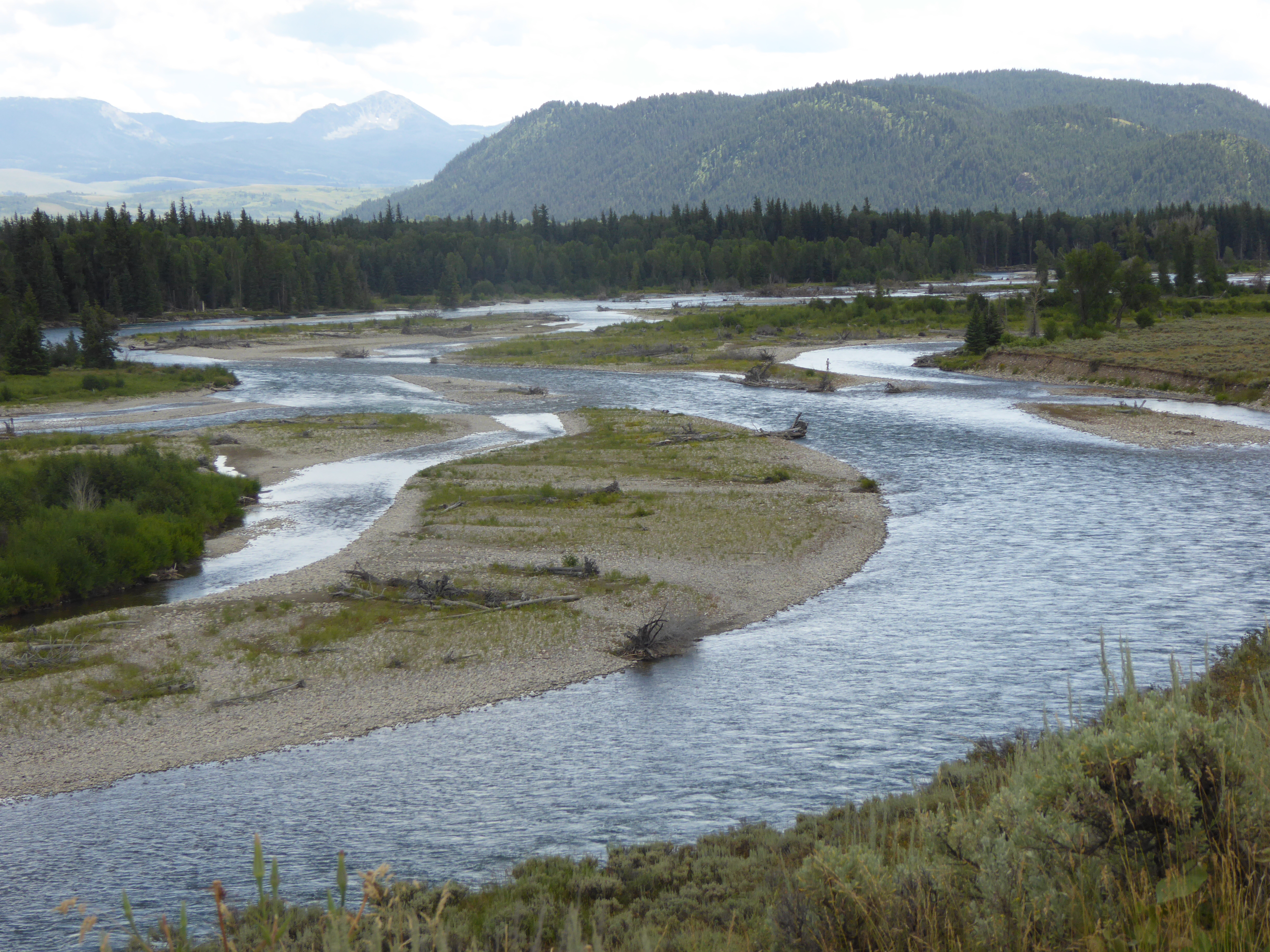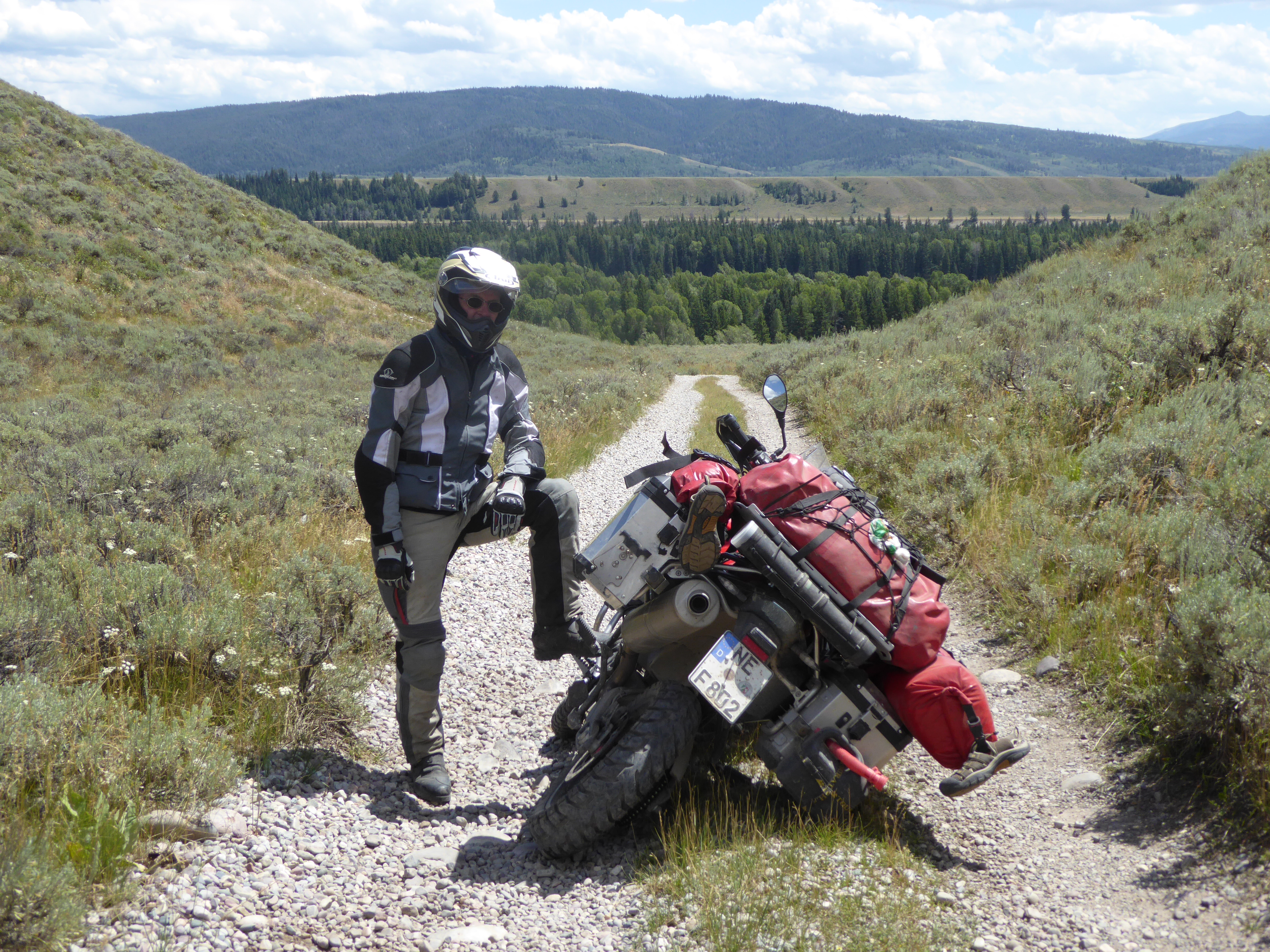 Morgens 6.00 Uhr, 0 Grad (richtig gelesen Null!) Das Thermometer klettert auf 30 °C. solche Temperaturschwankungen machen M. schwerer zu schaffen als mir. Wir verlassen den Yellowstone Richtung Süden und kommen in den Grand Teton. Die Berge rechts und links begleiten uns auf der einzigen Straße. Es soll eine Gravelroad entlang des Flusses Snakeriver (der ist über 1700 km lang) sein vor dem herrlichen Gebirgszug Teton. Schon bei der Einfahrt denke ich, na, das wird sicher kein Spaziergang. Nach einigen km ist dort ein Abzweig nach rechts, scheint aber in einer Sackgasse zu landen. Das Navi kennt den Weg geradeaus weiter nicht, der uns auch in die falsche Richtung führt. Wir drehen, und ich sehe vor mir die 3 Bodenwellen mit losem Kies und den dicken Steinen am Anfang. M. fährt die 15 m einfach hoch, auch wenn das Hinterrad auskeilt. Mich versetzt das in Alarm, vor allem, weil M. gleich mit der Kamera erscheint. Meinen folgenden Kommentar geb ich lieber nicht wieder. Auch wenn ich diese Stelle mit Bravour meistere, so bin ich doch furchtbar aufgeregt und gleichzeitig gibt es mir wieder ein Stück Sicherheit und Vertrauen in diese Reifen.