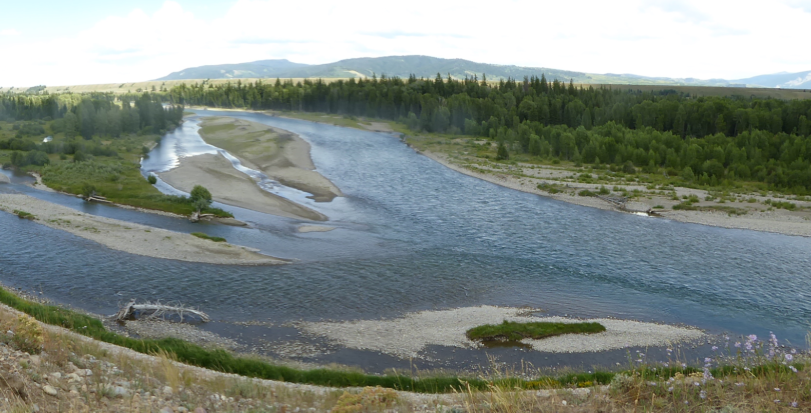 Für diese Arbeit werden wir mit einigen herrlichen Blicken auf einen wunderbar mäandernden Fluss entschädigt. Stolz wie Oskar bin ich dennoch froh, als wir nach 25 km stehender Rüttelei endlich wieder sitzender Weise auf Straße unsere Reise fortsetzen und nach 320 km Tagesetappe in Idaho ankommen, wo wir am Fluss campieren und uns bei einsetzender Dunkelheit schnell vor den stechenden Viechern ins Zelt retten und früh schlafen gehen. Was war das doch im Yellowstone schön, wo wir auf 2000 m Höhe davon verschont waren….
