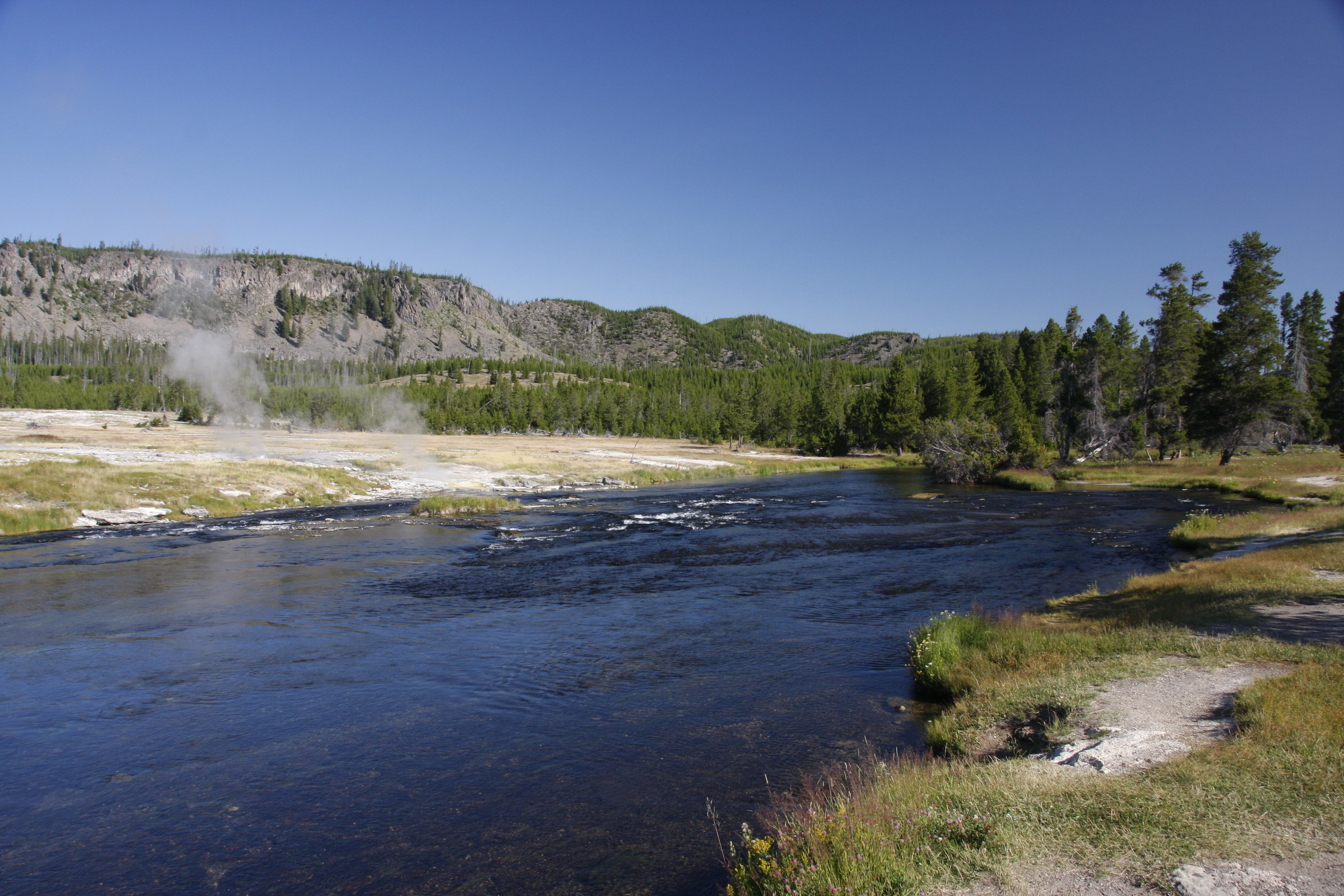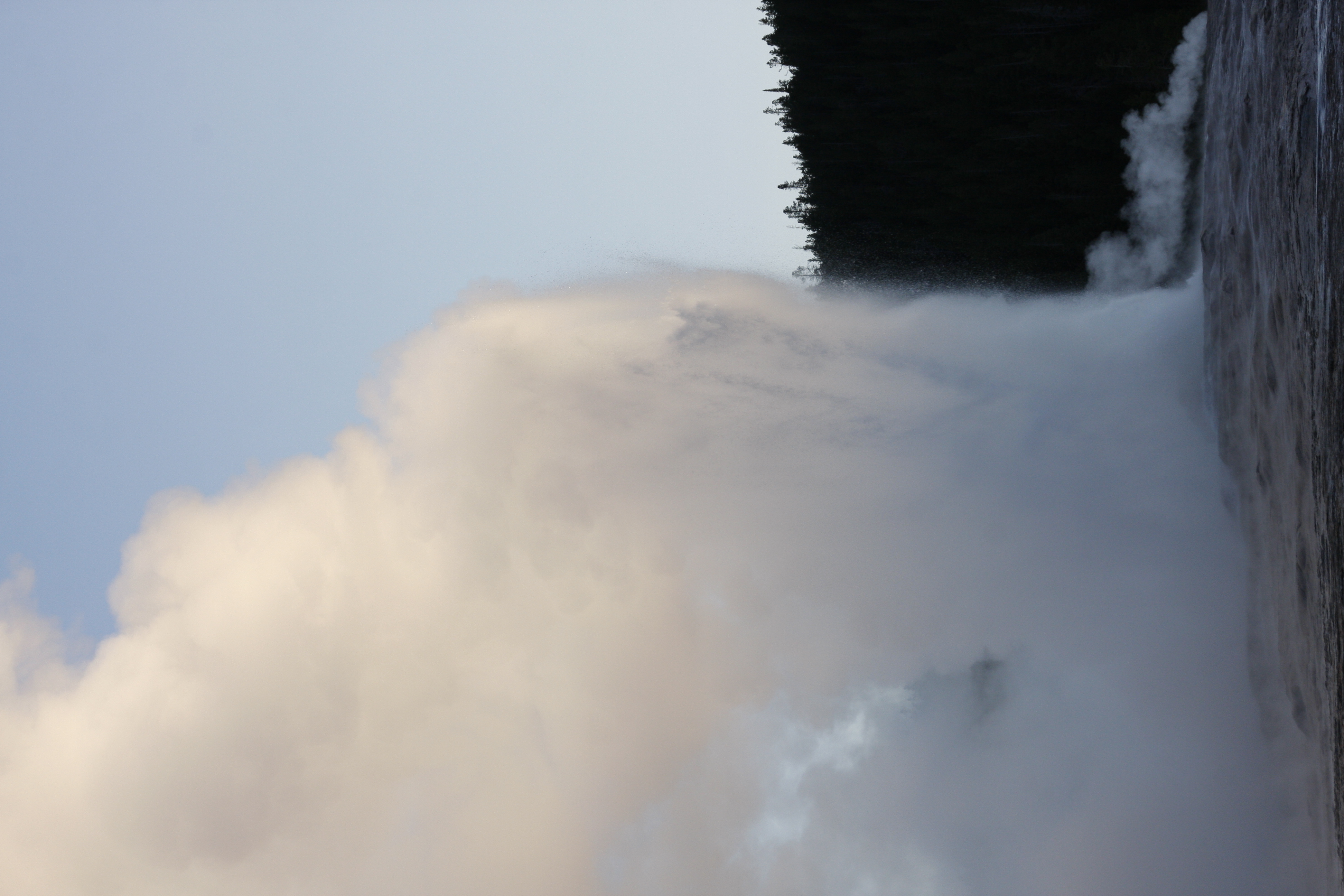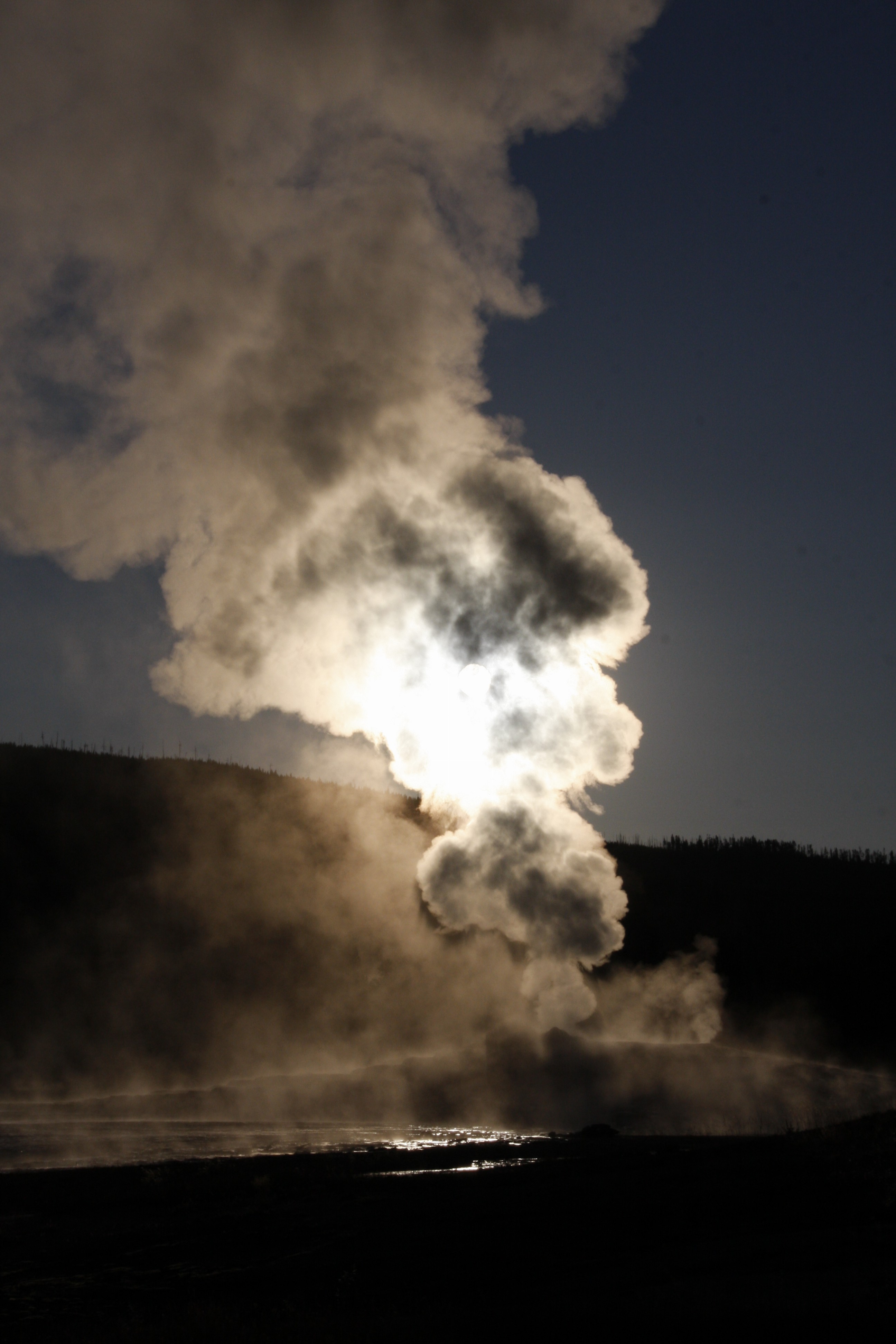 Old Faithfull, rechts das Wasser, links der Dampf morgens um 6.35 Uhr