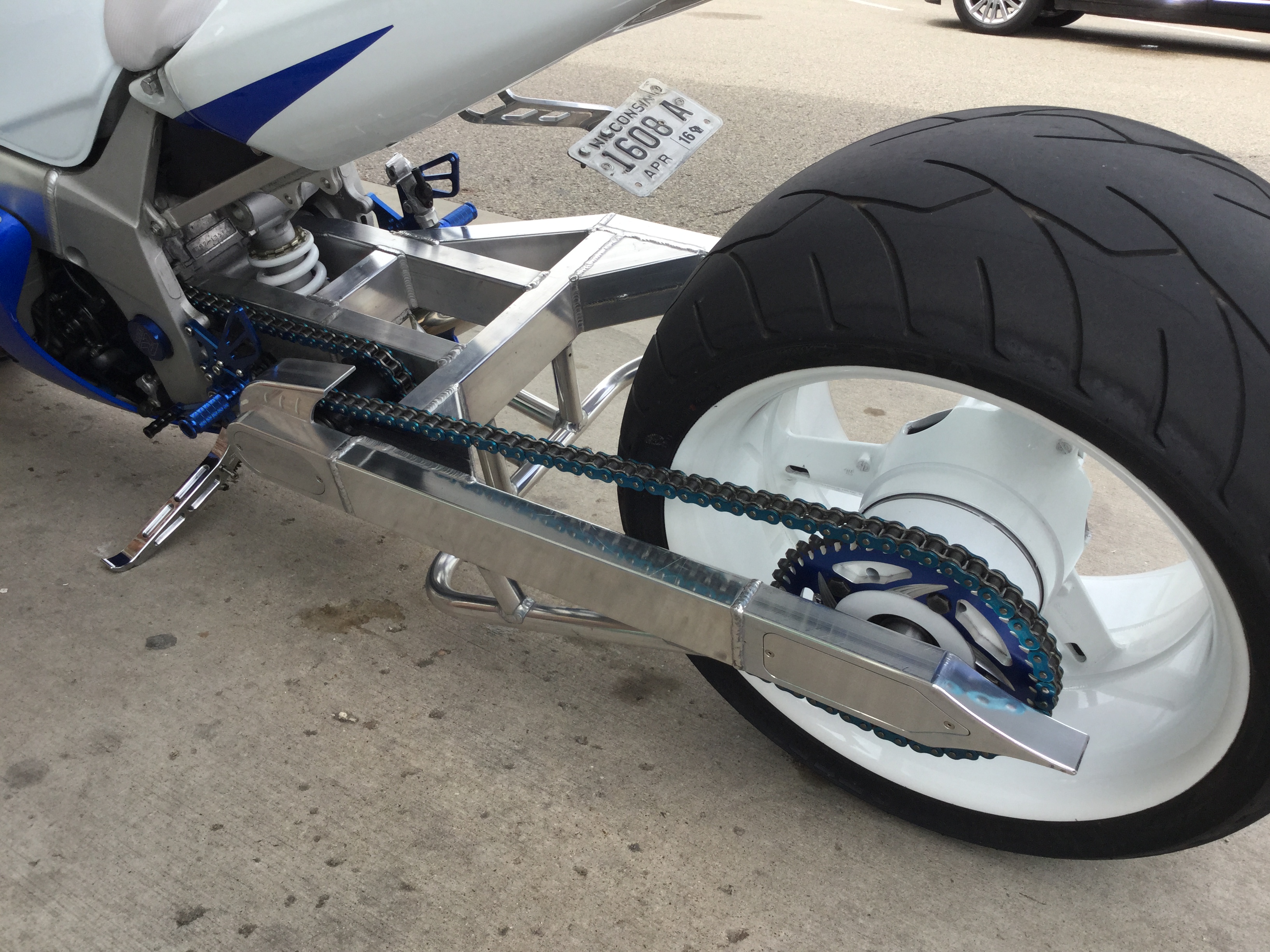 Nachtrag: Hier das Bild von dem dicken Hinterradreifen mit doppelt umgelenkter Kette wegen verlängerter Schwinge, wohlgemerkt, der Allerwerteste des Obendraufsitzers war genauso dick!!! (:-)