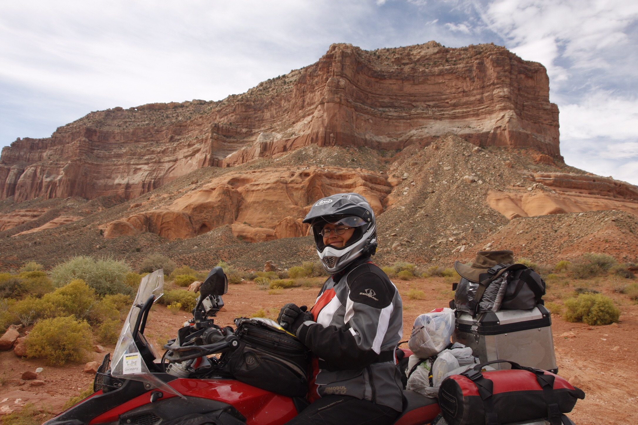Mutig gehts weiter. Es stimmt, der Weg bleibt zunächst viele km so sandig, wird aber zunehmend steiniger und felsiger. Auch die Auf- und Abfahrten werden steiler, gespickt mit losen dicken Steinen oder großen Steinplatten. Eine sandige Steilabfahrt mit Kehre und dicken Steinen und Stufen schaffe ich irgendwie heil runter. Wie ich hier wieder rauf kommen soll, weiß ich nicht. Aber das überlege ich mir, wenn ich wieder zurück fahre. Die stufigen Steine werden immer mehr, mit Vorliebe in steilen Stücken. Aber das kann ich ja nun mittlerweile ganz gut – Dank Jeff! (Hier ist Level 5 und ich hab ja noch eins in Petto ;-)….) Ich suche bewusst die Rumpelei über die Steine, denn da ist es fest und hiermit kenne ich mich gut aus. Ich fahre voraus, damit mich M. ggf. aufsammeln kann. Ist aber nicht nötig. Statt dessen bekommt er frei Haus „Tipps“ wie er es besser machen kann. So z. B. bei einer Steilauffahrt mit stufigen Felsenplatten. Ich bin zu schnell, die Maschine springt zwei mal kreuz und quer. Ich kann sie abfangen und ohne Abwürgen nach oben bugsieren. M. geht das ganze etwas langsamer an und so klappt es bedeutend besser.