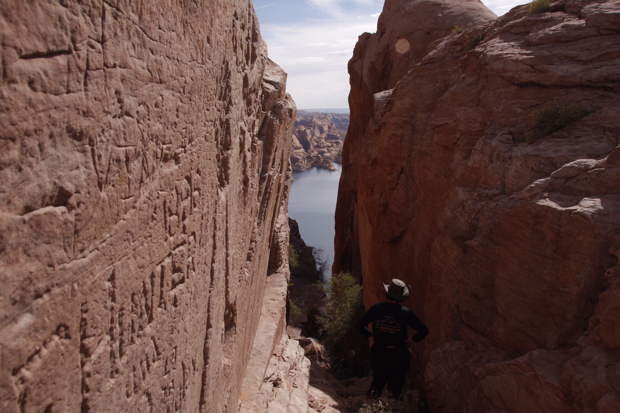 Irgendwann sind wir doch da. Es ist halb 12. Nur kurz schauen wir uns das Loch an und bestaunen die unwegsame Landschaft, durch die die Pioniere durchgerumpelt sind. Durch das Loch klettern wir ein kleines Stück hinunter, während unten der Colorado in leuchtendem Blau herauf grinst. Hier soll ein vollgeladener Wagen durchgepasst haben? Vorne Pferde? Hinten 10 Männer am Seil die sich gegen das Abstürzen stemmen? Die Armen! Allesamt! Unvorstellbar. Noch ein paar Bilder und auf, auf! Wir müssen zurück!