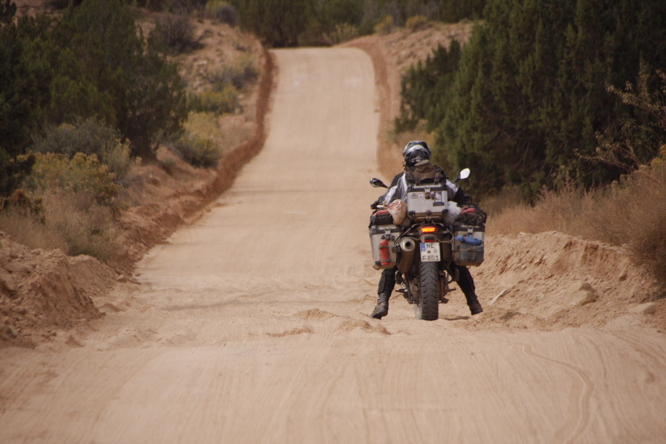 Ach ja! Wir sind wieder an der dicken Tiefsandstelle, die schlimmste des ganzen Weges. Ach, hab ich gar nicht gemerkt, dass wir schon hier sind. Der Herr wünscht, dass ich vorfahre und seine Fahrt auf Video aufnehme. Okee, dann fahre ich halt vor. Langsam im 1. Gang, mit paddelnden Füßen bis hinten hin. Es sind eh keine Nerven mehr da, die sich aufregen könnten. Wenn M. sagt, ich soll da durchfahren, dann fahre ich halt jetzt da mal durch. Ich hab heute eh mein Seepferdch… äh… „Sand“pferdchen gemacht. Ich stelle mein Mopped an der Seite ab und hole die Kamera heraus, mache sie an und gebe das Zeichen. Es dauert 3 Sekunden, da macht er plopp! Zack, er liegt im Sand.