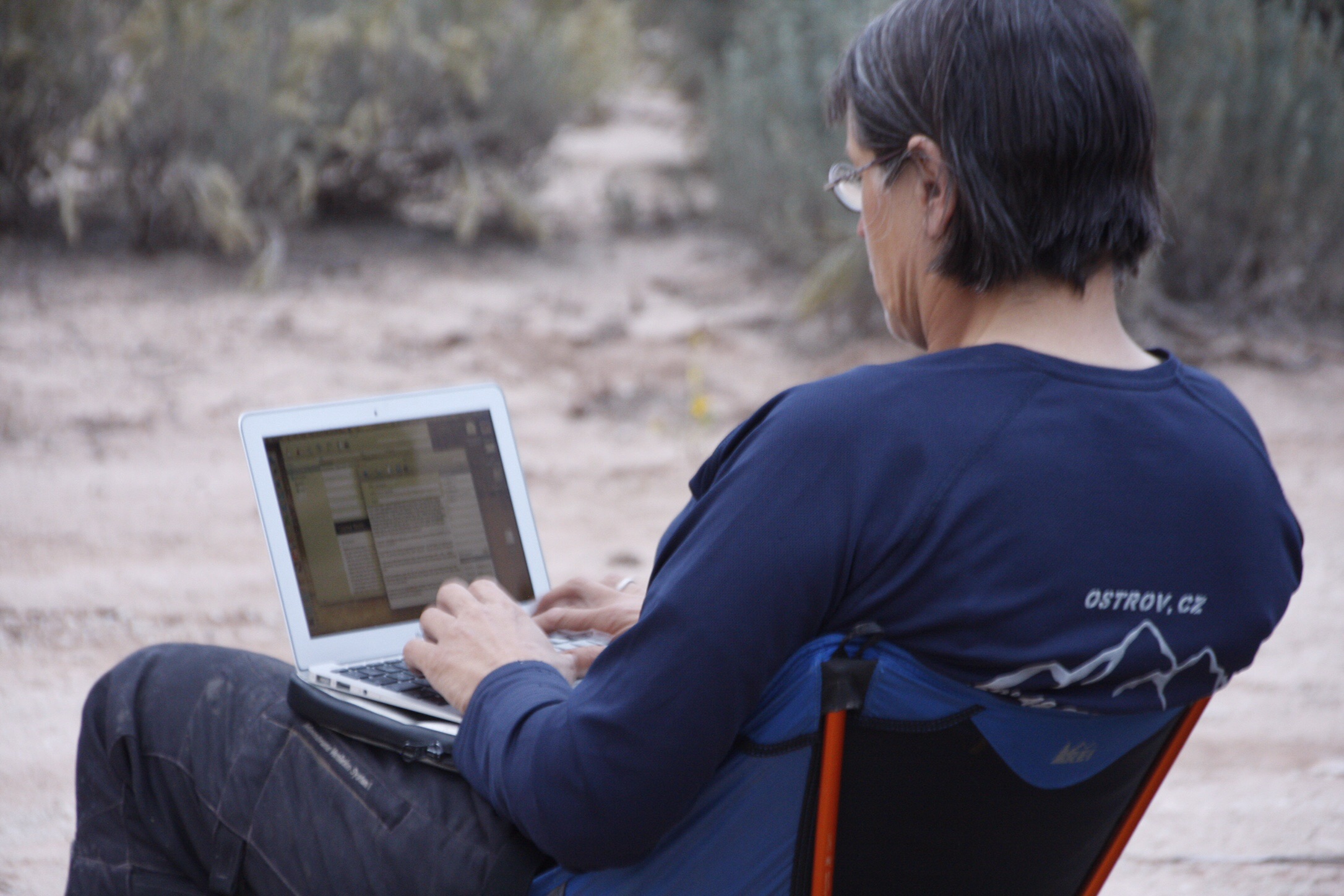 Irgendwann fahre ich die kilometerlange Tiefsandstrecke völlig allein. M. ist schon seit langem unsichtbar abgerauscht. Er braucht mehr Speed, wenn er im Stehen drüber bügelt. Ich mach lieber hösch! Ich hab heute Waffenstillstand mit dem Sand geschlossen. Den will ich nicht leichtfertig aufs Spiel setzen. Irgendwann komme ich um die Kurve gezockelt und M. räkelt sich im Sand und gähnt, während sein Mopped auf der anderen Seite steht. Ohne Kamera? Hä?