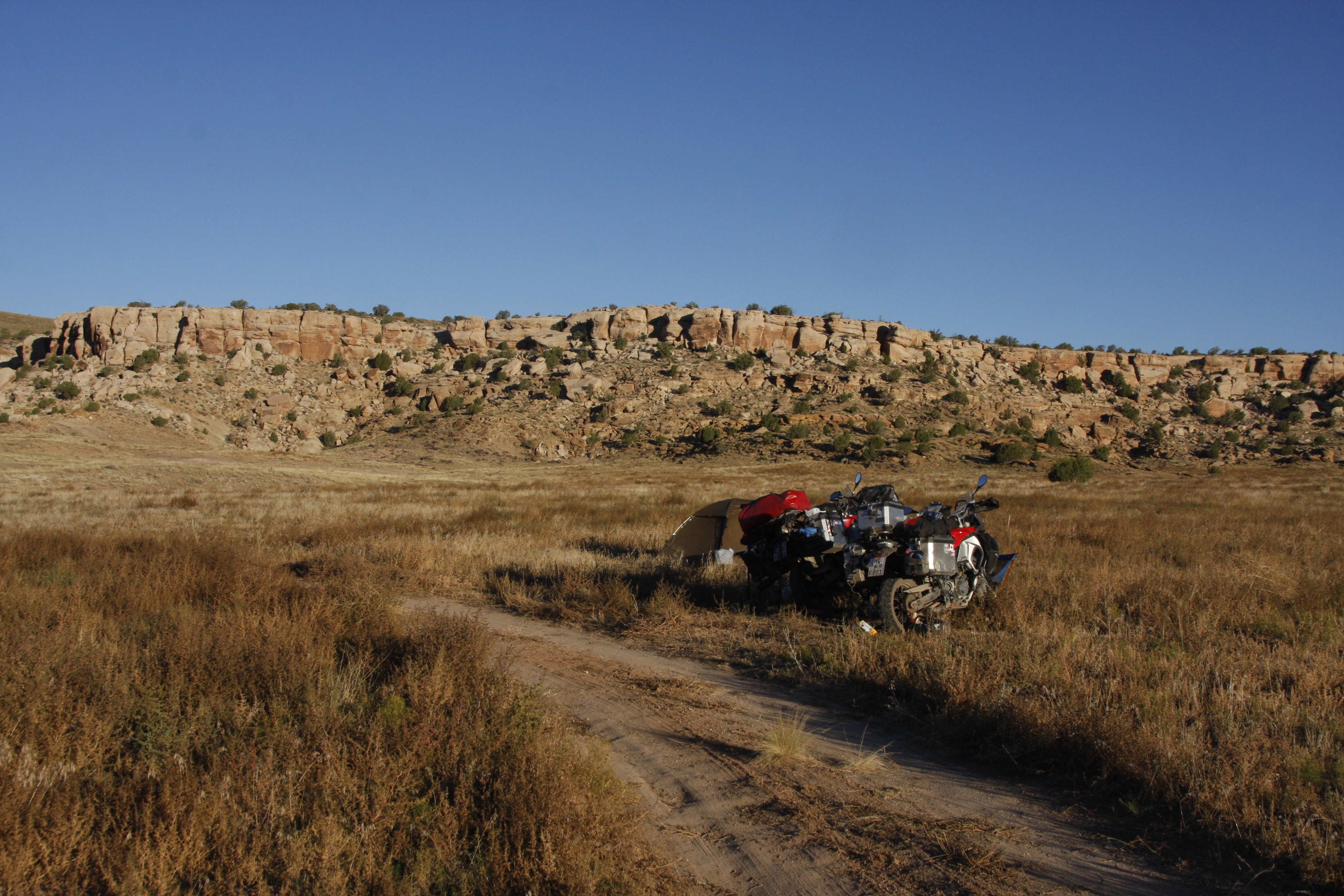 Wir fahren vom Mesa Verde Nationalpark Richtung Monument Valley. Da ich morgens mit allerlei gesundheitlichen Problemen zu kämpfen habe, brauche ich entsprechend viele Pausen und für alles doppelt so lang. Wir schaffen es bis kurz hinter Cortez. Campingplatz oder Wild? Wenn es ein Plätzchen gibt, lieber wild, aber hier sind die kargen Ebenen alle eingezäunt. Plötzlich hören die Zäune auf. Prima, schnell ist abseits der Piste was gefunden, auch wenn die trockenen stacheligen Sträucher überall ziemlich nerven. Wir lassen lieber die Stiefel an. Wir stehen nicht lange, da biegt ein Auto in unsere piselige Straße ab, hält an und lässt die Scheiben runter. Zwei Männer offensichtlich indianischen Ursprungs grüßen freundlich und beginnen einen netten Smalltalk. Sie erkundigen sich nach unserer Herkunft und was wir so vorhaben. Wir erkundigen uns auch nach ihnen und sie erzählen, dass sie aus  Cortez von der Arbeit kommen und jetzt nach Hause fahren. Der eine wohnt direkt hinter dem Hügel. Das Haus kann man gegen die Sonne aber gerade nicht sehen. Oh – dann stehen wir gerade auf seinem Grund? Well, ja, aber das stört ihn nicht. Wir fragen nach, ob wir tatsächlich auch die Nacht hier verbringen dürfen, und er erlaubt es uns. Prima! Dann kann ja nix schief gehen. Der Fahrer kommt bald zurück, fragt nach, ob wir alles haben oder etwas brauchen. Dort hinten gäbe es ein Wasserloch – echt nett – aber wir haben alles, danke! Er erzählt, dass er oben auf dem Berg dort wohnt und seine Schwester dort hinten, wo das Licht brennt.