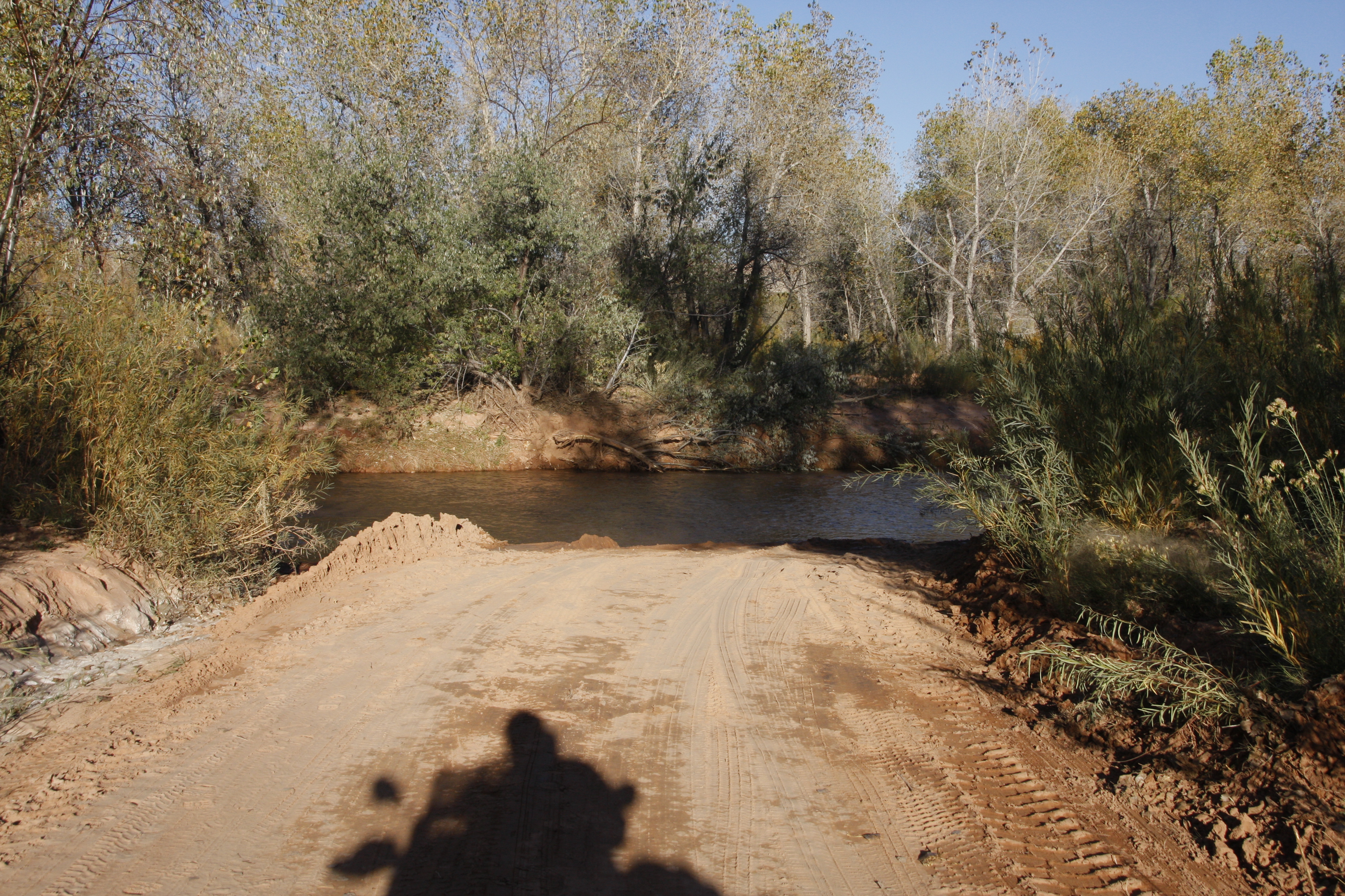 Mittlerweile brennt die Sonne bei knapp 30 Grad. Wieder gibt es nirgends Schatten. Seit Tagen haben wir keine Bäume gesehen, nur Dornengestrüpp und kahle Berge, die allerdings wunderschön und wie angemalt aussehen. Wir machen uns auf zum nächsten „Ort“. Der ist aber 150 km entfernt und mir brennt dir Birne weich, obwohl ich dauernd trinke. Das Monument Valley ist nur ein kleiner Teil von dieser grandiosen Wüstenlandschaft. Dies stellen wir auf dem Weg nach Hanksville fest. Hinter jeder Kurve eine neue Reihe der von Erosion übrig gebliebenen Bergreihen, übersäht mit Skulpturen, Ornamenten, Figuren, Gesichtern oder sonstigen von der Natur geschaffenen Gebilden. Kurz vor Capitol Reef (ein weiterer Nationalpark) suchen wir uns ein Schlafplätzchen. Auf dem Weg zum Cathedral Valley wären wir fast in der Furth gelandet. Aber der Fluss fließt schnell und ist am Eingang sandig und trübe. Man muss 10 m den Fluss runter fahren und dann auf der anderen Seite wieder raus. Das Ufer ist dicht bewachsen, man sieht nichts.