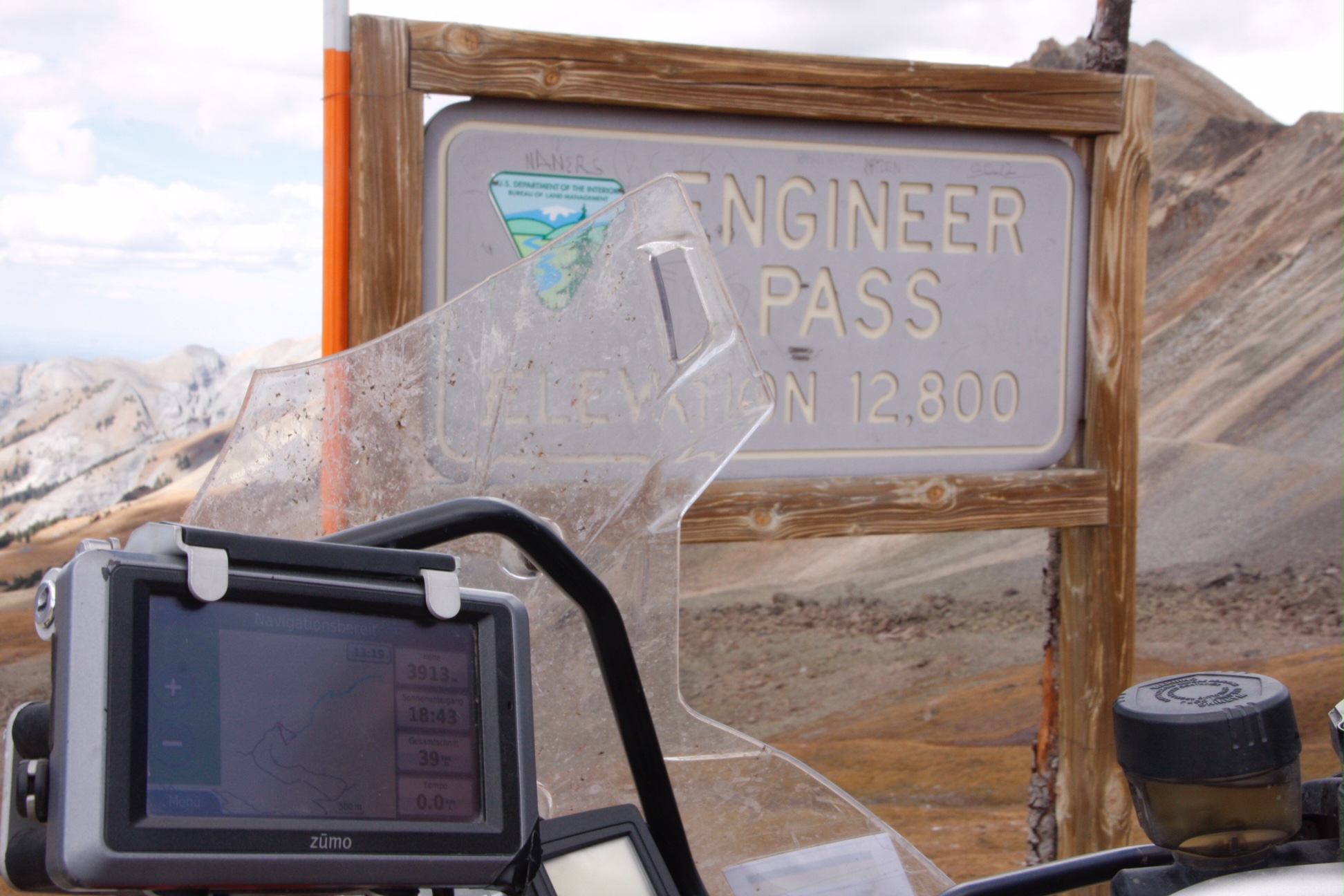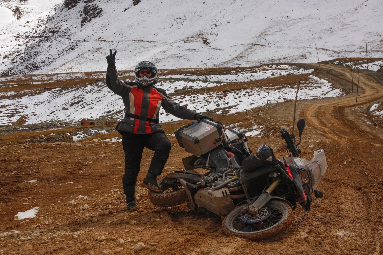 Zurück geht es bedeutend leichter, denn jeder Meter im Sand heißt auch, wieder einen Meter in Richtung Ausgang! Langsam klettern wir in Schrittgeschwindigkeit die stufigen Steilhänge wieder runter. Das haben wir ja am Engineerpass gelernt. Manches Mal wundere ich mich über mich selbst: Hier bist du eben hochgefahren? Das hatte ich gleich wieder verdrängt vor lauter Konzentration der nächsten Schwierigkeiten. Die kurzen Sandstücke dazwischen versuche ich ohne Schlagen und Auskeilen zu meistern, erst mit beiden Füßen unten, dann wenigstens mit einem Fuß auf der Raste. Jep, klappt gut. Etwas schneller im 1. Gang mit beiden Füßen oben, nur geradeaus (und mit Luftanhalten)? Ja, geht auch. Vielleicht auch mal im 2. Gang, der Sand ist doch nicht so tief. Es wird besser und besser, je länger die Sandpassagen dauern. Wenn grade fester Untergrund ist, überlege ich fieberhaft, wie ich das eben runter gefahrene Knusperstück wieder rauf komme. Sandige Stufen mit Kehre am Lenker hängend, ist keine gute Idee, da das Vorderrad zu leicht wird. Da tänzelt das Vorderrad hin und her und macht was es will, weil ich wegen des Tankrucksacks nicht weit genug nach vorne komme. Der muss nach hinten, auch wenn dann das Gewicht hinten noch mehr wird. Einige steinige Steilhänge habe ich noch Zeit zum Üben. So geht es viel besser, trotz Gewicht hinten. Da ist der Sandberg. Im Sitzen langsam gerade nach oben bis in die Kehre, fast an die Wand. Dort auf die Füße, über die dicken Steine am Rand langsam drehen und mit mehr und mehr Gas den Steilhang rauf. Yeah!!!! Oben! Obwohl der Sand immer mehr wird, mein Herz immer ruhiger.