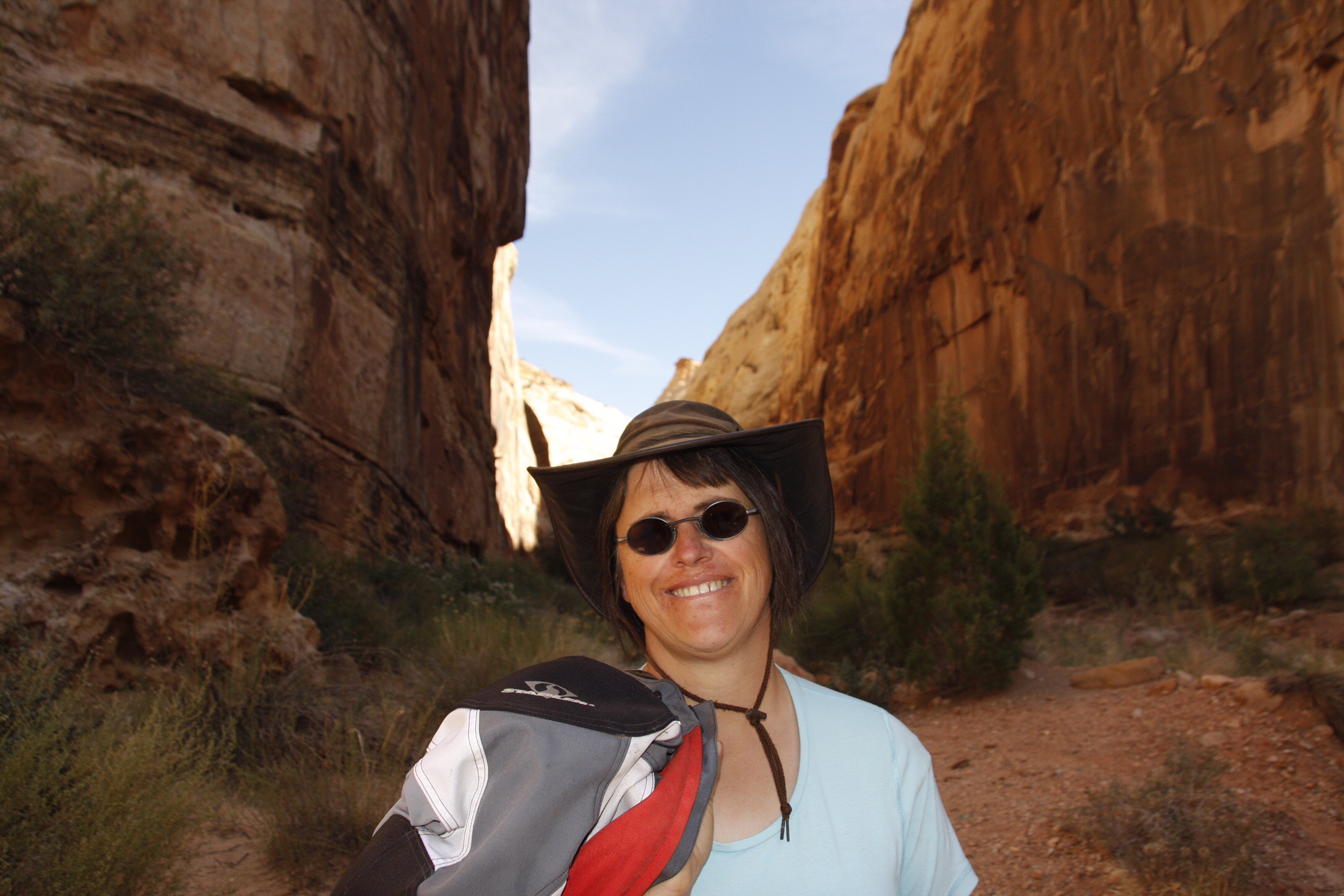Irgendwann sind wir doch da. Es ist halb 12. Nur kurz schauen wir uns das Loch an und bestaunen die unwegsame Landschaft, durch die die Pioniere durchgerumpelt sind. Durch das Loch klettern wir ein kleines Stück hinunter, während unten der Colorado in leuchtendem Blau herauf grinst. Hier soll ein vollgeladener Wagen durchgepasst haben? Vorne Pferde? Hinten 10 Männer am Seil die sich gegen das Abstürzen stemmen? Die Armen! Allesamt! Unvorstellbar. Noch ein paar Bilder und auf, auf! Wir müssen zurück!