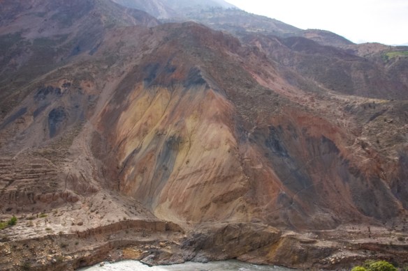 Meine übliche Verkrampfung am Anfang kann ich schnell lösen, denn mein Körper und meine Muskeln erinnern sich daran, wie es geht. Als auch endlich das Kopfkino aufhört, komme ich gut hinter M. her und kann auch etwas von der spektakulären Landschaft aufnehmen, denn das Tal wird sehr eng. Die Felder haben aufgehört und es gibt hier nur steile (Sand-) Felsen, Steine und den Fluss. Welche Farben die Berge haben, wie von einem Künstler gemalt.