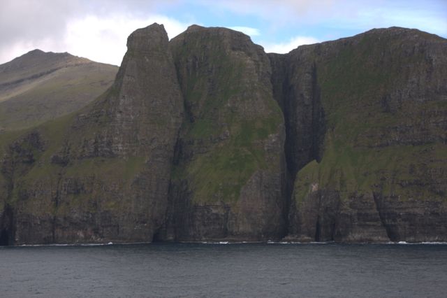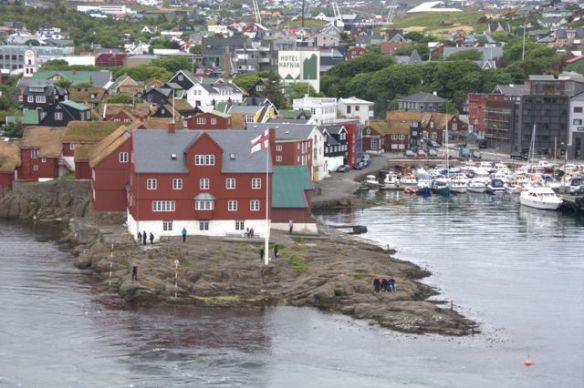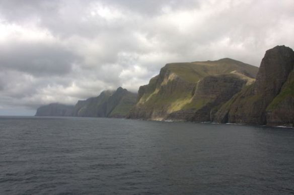 Nachmittags laufen wir in Thorshavn, dem Hauptort der Faröer-Inseln ein. Die Fähre überragt alle Gebäude der Inseln, die bunten Häuser wirken von Deck wie Spielzeug. Nach einer dreiviertel Stunde laufen wir wieder aus und quetschen uns durch die engen Fahrwasser zwischen den Inseln hindurch. Dramatische Steilküsten und liebliche Wiesen ziehen an den Bordwänden vorbei. Schade das wir keine Zeit haben, diese Inselwelt zu erkunden.